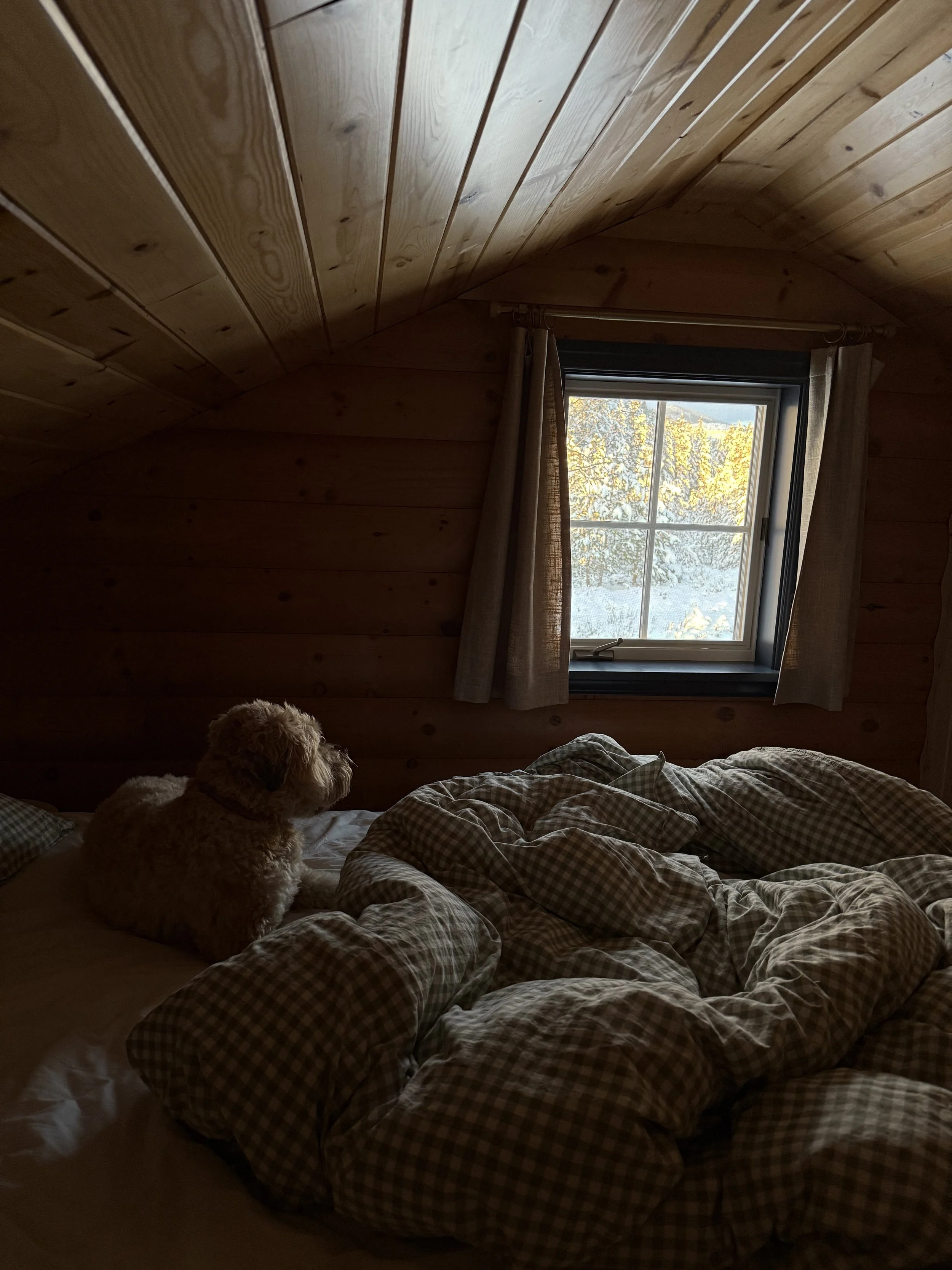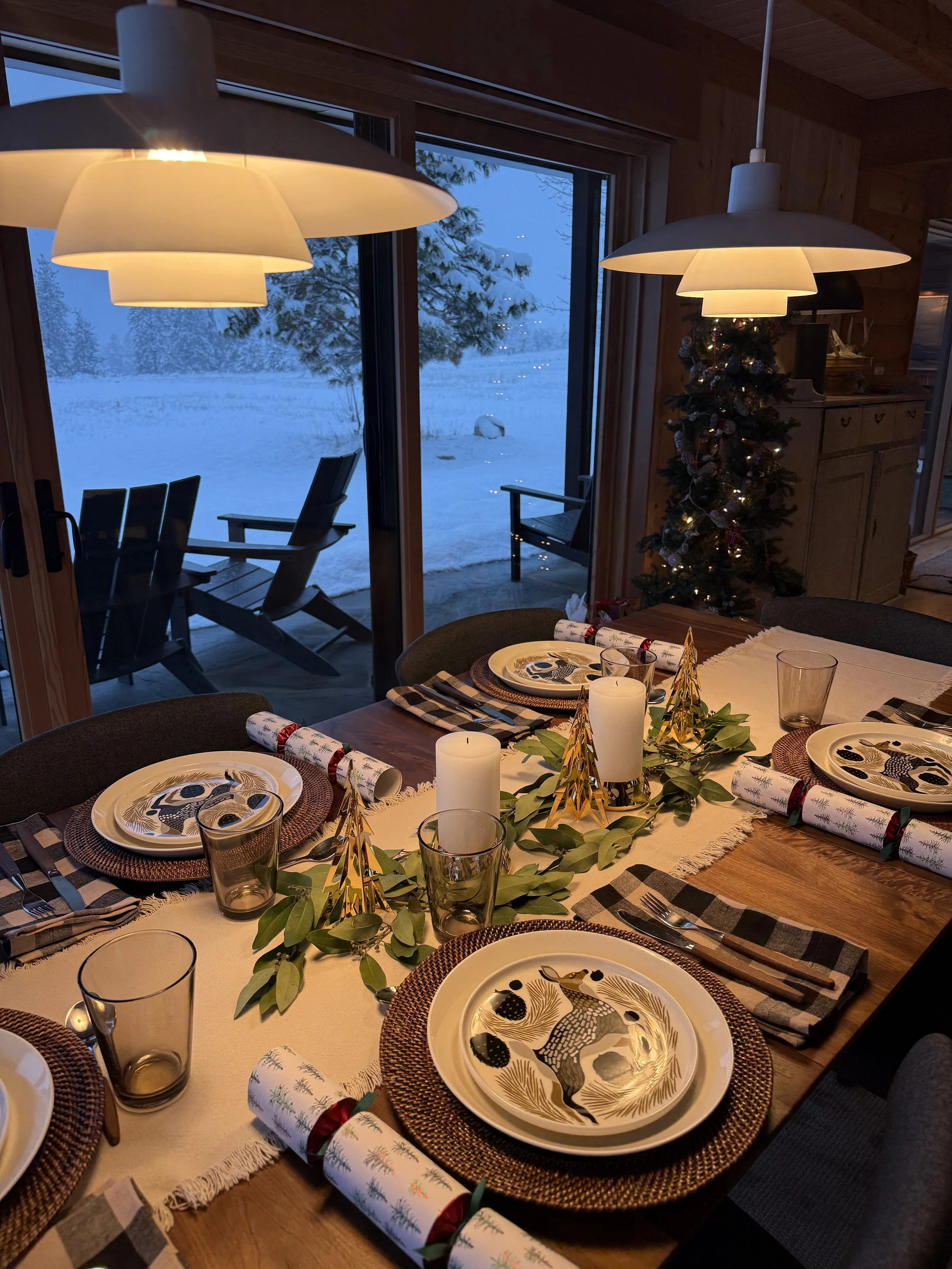 The retreat takes place in a cozy, inviting cabin in Methow Valley, inspired by Norwegian hytte (mountain cabin) and Scandinavian design. The space is warm, comfortable, and full of character, perfect for a winter escape.